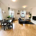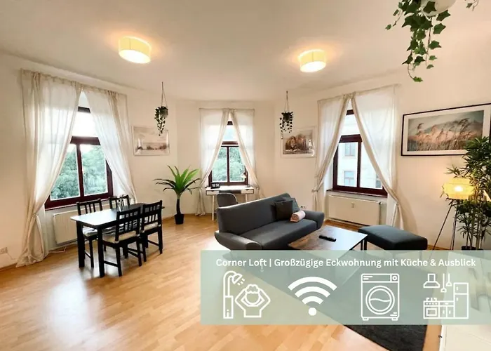都市の景色を見渡す広々とした寝室1室のStaytime - Corner Loft ドレスデンアパートは、ドレスデンのドレスデン交通博物館から徒歩で25分です。